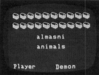 The scorekeeping part of the screen displays the player's and the demon's points. Two points are accrued for each letter in the word. If the child takes more than one try to spell the word correctly, points are split with the demon. In this case, a demon holding a money bag takes the place of the closed treasure chest. If the child has to consult the demon for help (by typing an asterisk), the demon gets all points, and an empty treasure chest appears on the screen.