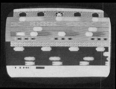 Finally, there is a time limit within which the frog must reach home. Each frog gets 120 counts which amounts to about 32 seconds. The "clock" appears as an orange bar at the bottom of the screen, and it shortens as the time runs out. When a frog is lost, a skull and crossbones appears briefly at the frog's last position. In addition to the "bleep" when the frog hops, there are appropriate sound effects when a frog is lost.