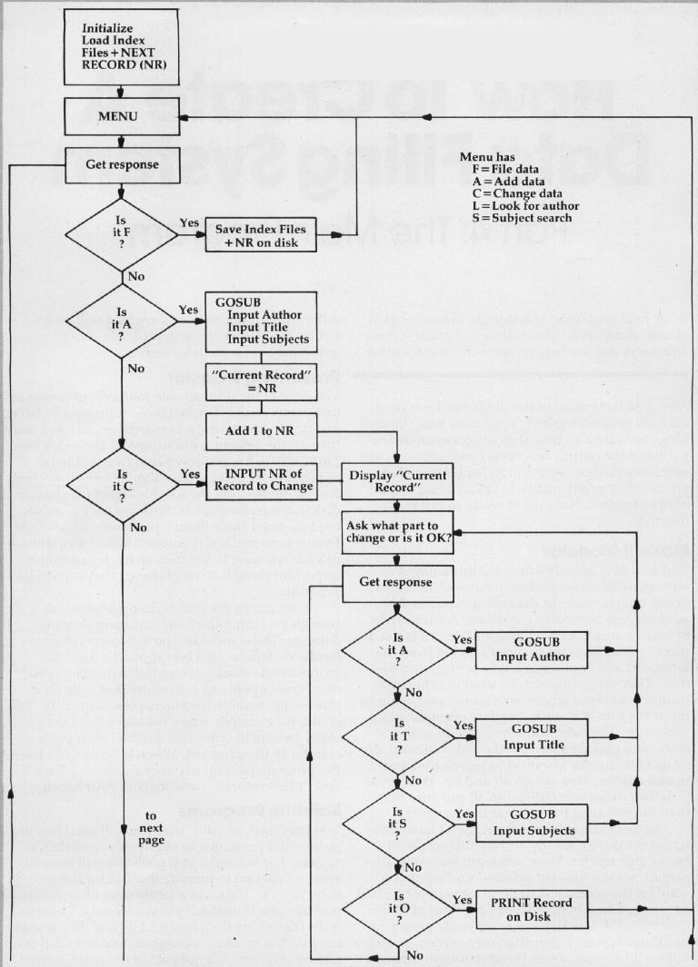In the accompanying flowchart, I have illustrated the design for my author-subject file of books and articles. How you want your data displayed, what you want printed, and what you want on the screen will depend on your individual situation. Some people want a printout of their input as well. It is also easier for some people to proofread text on paper than on a screen, so customize it for your needs. Your requirements will differ from mine, so your flowchart will be different, too. However, you probably should use subroutines in a modular fashion.