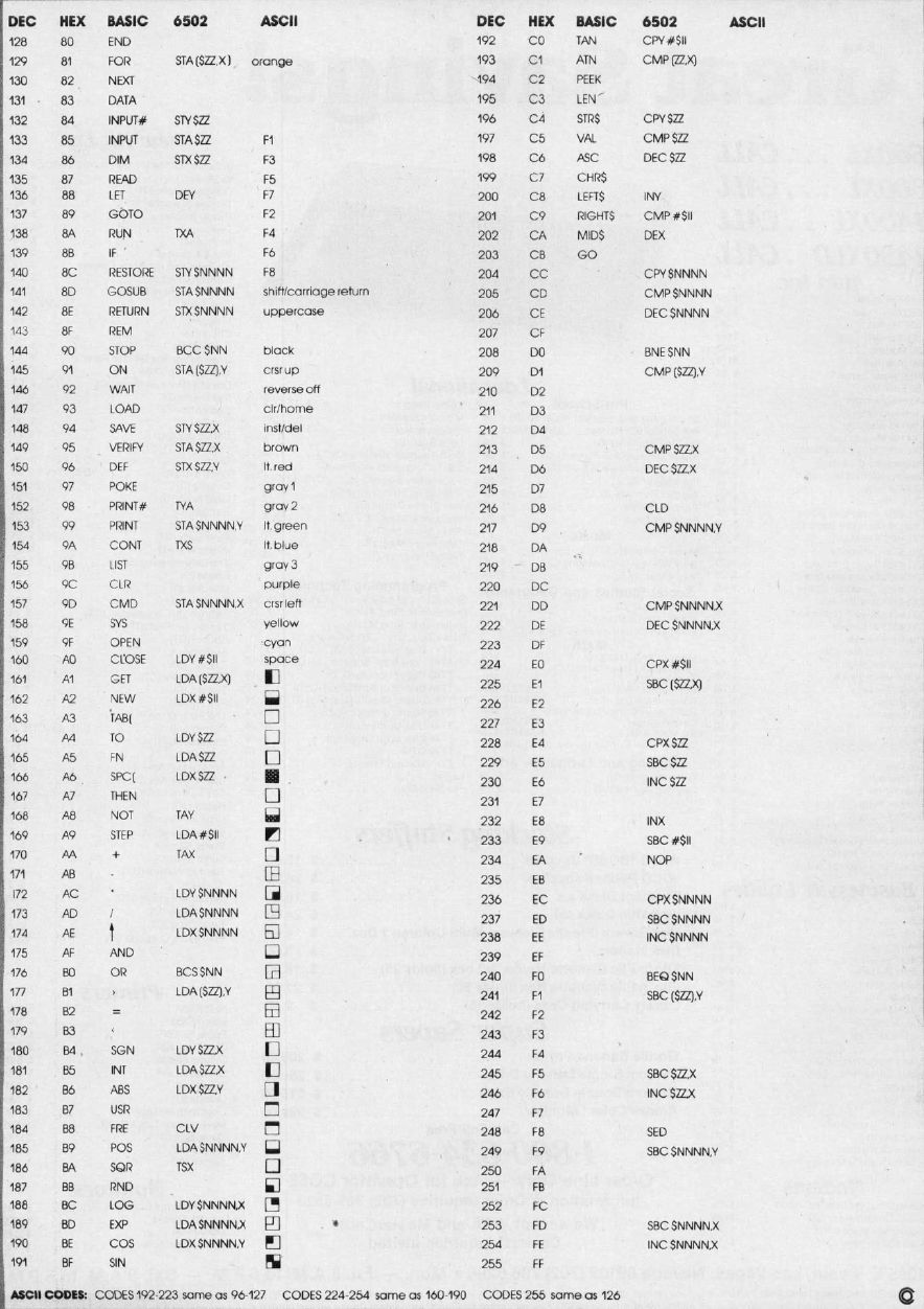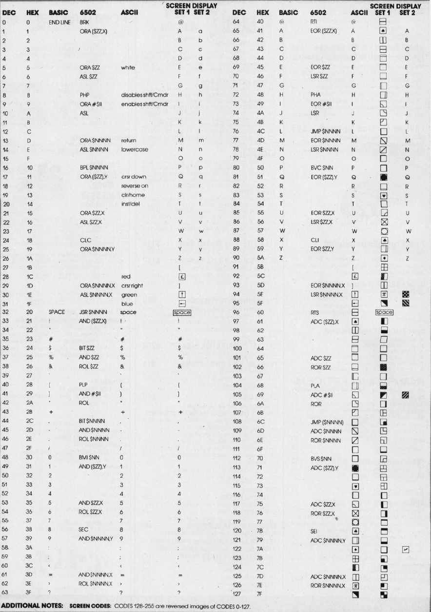 Here's a handy and essential chart, including information on decimal, hexadecimal, BASIC, 6502, ASCII, and screen POKE codes. Please note the following conventions: