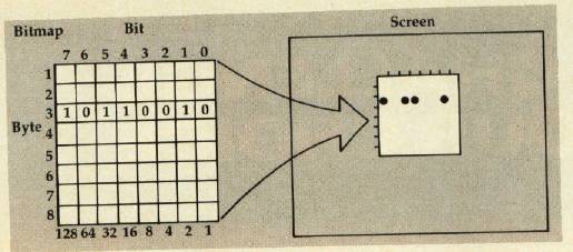 The eight bits in each byte control one pixel in that row — the highest valued bit controls the leftmost pixel and so on through the lowest valued bit, which controls the rightmost pixel. Graphically, the process works as follows: