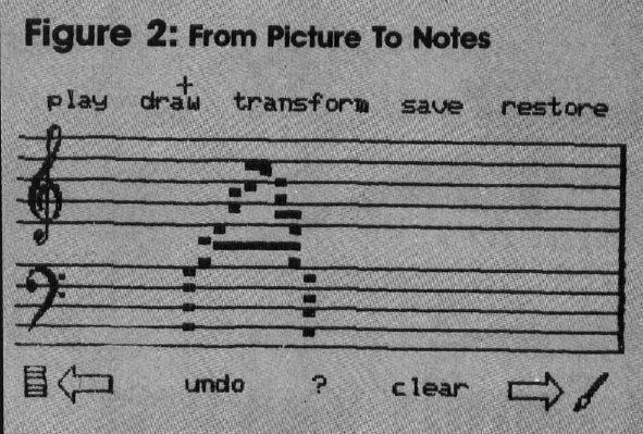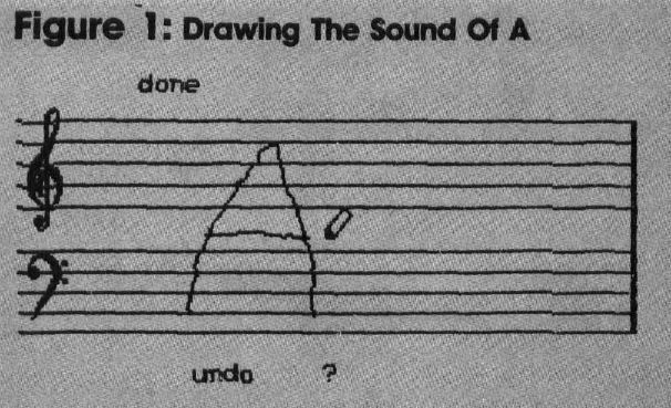 Music Doodles lets you create motifs by "drawing them" on a grand staff appearing on the screen. For example, if you wanted to hear some music that looks like the letter A, all you would have to do is draw an A on the screen (see Figure 1).