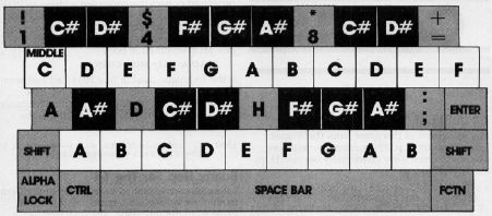 Also, if you play the piano and are familiar with its keyboard arrangement, you'll find that looking for letters feels unnatural and difficult. Hence, "Musical TI Keyboard," which makes the computer's keyboard more closely resemble that of a piano.