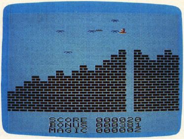 Once the game begins, you fly toward the right of the screen by pushing the joystick while keeping a watchful eye out for the sorcerer's birds. At the bottom of the screen is your score, the amount of magic you have left, and the bonus points you'll receive for rescuing Blondell. The Atari version awards 50 points for each bird you destroy with a lightning bolt, and 10 points for each bird that crashes into the ground while in wild pursuit of your flying carpet. The Commodore versions award only 10 points for birds, no matter how they meet their end. In all versions, the rescue bonus decreases with time, so you might want to be expedient in your quest.