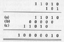 The decimal equivalent of this multiplication is 26 X 5 equals 130; but it's more interesting to see the binary workings. The intermediate values that we add (lines a and c) correspond to the original multiplicand, appropriately shifted. There's a zero in there too (line b), but a multiplication program wouldn't go to the trouble of adding zero. Instead, it would skip the addition.