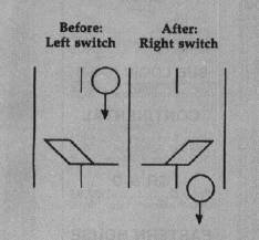Switchbox is a tale of twos: Each switch has two parts, two positions, two states, two paths in, and two paths out. The two parts are the platform and the trigger. A switch can lean to the left (platform left, trigger right) or to the right (platform right, trigger left):