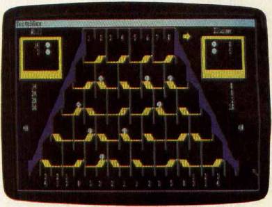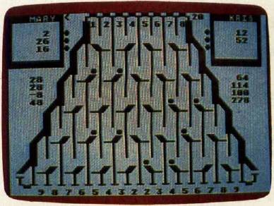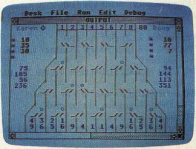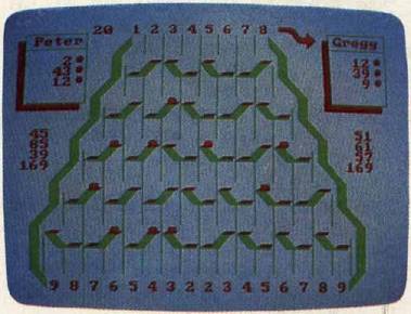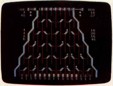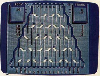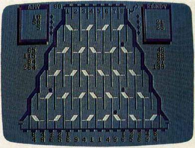 The DATA statements at the beginning of the program (the Setup: routine in the Amiga version) determine the goal for each round and the point values for the exit paths. You can prolong the game by doubling the goals; this also dilutes the value of a big score at the beginning of a round, preventing one player from winning on the first or second turn. An interesting variation is to assign negative values to some slots. If some paths score negative points, you are forced to think harder about where the balls will drop.