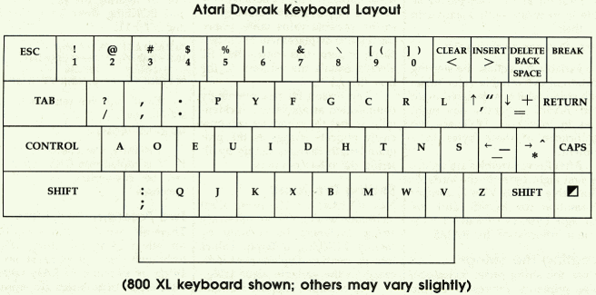 A few modifications to the standard Dvorak layout were necessary because of the special functions and extra keys on the Atari keyboard. The seldom-used brackets may be typed with CTRL-9 or CTRL-O. The + = key, normally located at the upper right of the Dvorak keyboard, has been moved down. The * \ key has been retained in its standard Atari position because these characters have extra use as arithmetic functions in programming. Since the Atari has no cent symbol, this has been replaced with the vertical line as uppercase 6. In place of the asterisk (uppercase 8 on the Dvorak keyboard) is the backslash. The ` " key has been exchanged with the ; : key to avoid conflict between the CTRL-up arrow and CTRL-semicolon.