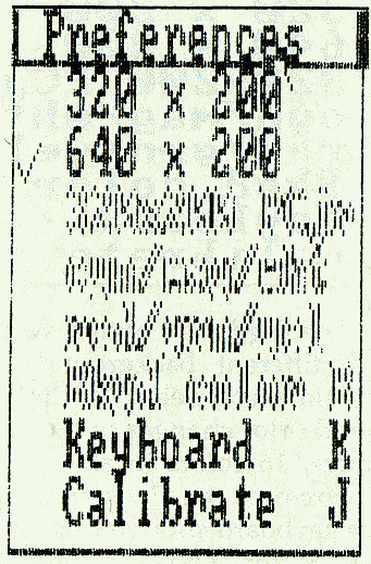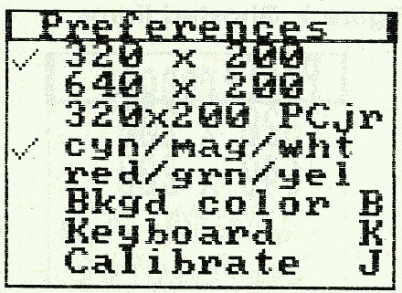 If you select 640 x 200 mode, some menu items under Preferences are no longer appropriate. It isn't possible to switch color palettes or change the background color while in 640 x 200 mode, so the inappropriate menu selections need to be disabled. Also, the 320 x 200 PCjr mode, which permits 16 colors, only works with the PCjr, so this selection should be made inaccessible when running on a PC.