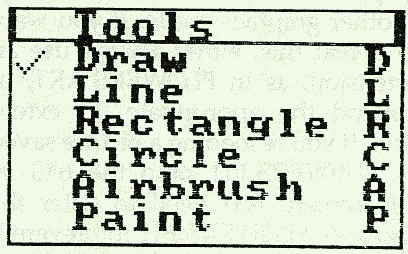 To access a menu, just move the arrow cursor so that it points at one of the menu titles: Picture, Toots, or Preferences. The tip of the arrow is the active point, so make sure it is within the menu bar and touching the desired menu title. Now press and release the button. (The keyboard equivalent for the button is the INS key, conveniently located beneath your thumb when you use the cursor keypad.) The menu title reverses color, and the menu drops down.