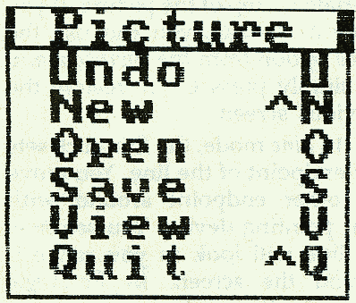 For example, if you point to Picture, then click the button, it drops down a list containing the choices Undo, New, Open, Save, View, and Quit (see figure 3). To the right of each selection are the keyboard equivalents: U, ^N, O, S, V, and ^Q. Instead of pulling down a menu and selecting a choice, you can just press the appropriate keyboard shortcut. The ^ character indicates that you should press the CTRL key along with the following character: ^N means that you should press N while holding down CTRL.