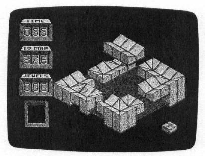 With each screen you conquer, you're mapping an unknown world in the 3D science-fiction arcade game, Spindizzy, from Activision for Commodore and Apple computers.