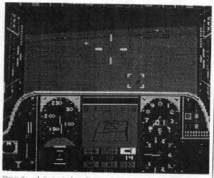 This is the cockpit view in the realistic attack-helicopter simulation, Gunship, from MicroProse, for the Commodore 64. Other versions will follow.