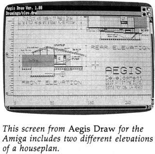 Two examples, Easy Draw for the ST and Aegis Draw for the Amiga, are programs of a type that virtually didn't exist in the home computer market as recently as two years ago. As the photos illustrate, these programs are primarily intended for making structured drawings for architecture, engineering, business charts, and similar pursuits.