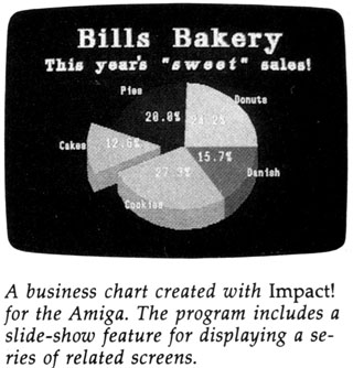 Business graphics are another newly emerging category. As you might expect, business-specific pro grams such as Impact!, another Aegis package for the Amiga, place heavy emphasis on charts, graphs, and text.