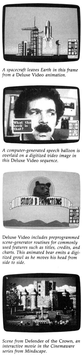 Deluxe Video, a current Amiga offering from Electronic Arts, lets you create your own "videos" com plete with detailed moving graphics and musical accompaniment or sound effects in the background. This highly sophisticated package (it occupies three Amiga disks) provides everything you need to create quite elaborate animated sequences. You may import IFF-format image files from Deluxe Paint and sound effects or music files from Deluxe Music and compatible programs. The program is also compatible with the Amiga frame grabber, a utility that captures digitized video images in IFF-format files, and the genlock peripheral, which lets you overlay Amiga-generated graphics onto other video footage.