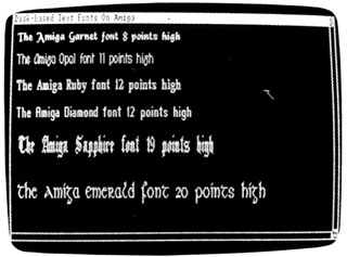 The Amiga, Macintosh, and Apple IIGS also have a number of predefined fonts (text styles) that can be substituted for the normal system font. The following photo illustrates various fonts available on the Amiga. These patterns are part of the system software: You can simply load the desired font from disk and instruct the computer to use it in place of the normal font.