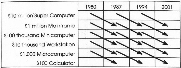 I was reminded of my color-TV experience when I heard a presentation by David Moursund from Oregon State University at a conference I attended a few months ago. David's point was that computer technology is advancing at such a rapid pace that, in a mere seven years, the price one has to pay for a given amount of computing power decreases by a factor of ten. The accompanying figure shows what I mean. Let's suppose that we can define six classes of computer technology ranging from the $10 million super computer to the $100 calculator. If we start our chart at 1980, we find that in 1987 we can get mainframe power for what we use to spend for a minicomputer, a personal workstation for the price of a mini, and so on down to the ubiquitous calculator. It doesn't matter if the number is exactly seven years for all classes of machine, the point David made is well taken—computer technology is not standing still, and it probably never will.