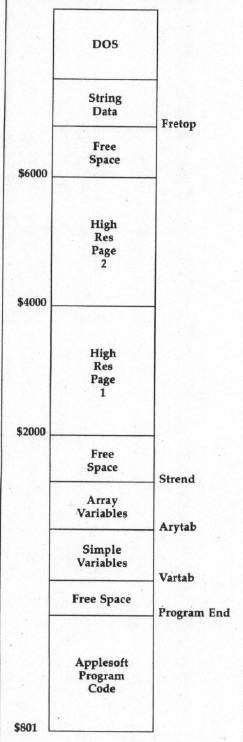 If SECOND sets VARTAB, ARYTAB, STREND, and FRETOP to the values in effect when FIRST was exited, all of FIRST's variables will be available to SECOND. The only exceptions are strings that were assigned values by literal statements in FIRST—for example, A$ = "THIS IS A STRING"—rather than by an INPUT statement, a disk read, or another string operation. Such strings must be reassigned. This is because of the way Applesoft handles string variables. The entry for a string variable in the variable table doesn't actually contain the text of the string. Instead, it contains a pointer holding the address of the string's text. The text of strings assigned by INPUT or created by some string operation will be stored in the tables above FRETOP. However, for strings with literal assignments, the variable table entry will point to the literal statement in the program text. When another program is chained, the program text containing the literal definition will be overwritten, but the variable table entry will still point into the program text area. Thus, the string assignment is no longer valid.