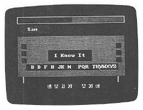The Action Board can be found directly below the names of the players. At the bottom of this board is the alphabet. A mystery word appears in the small box which appears to hang from the Board. At first the word is made up of black squares in the place of the mystery word letters. Players use the mouse to point at and click on the letter of the alphabet that they wish to guess. If the chosen letter can be found in the word, each occurrence of the letter lights up in the word and the player gets another turn. In addition, the Power Bar moves slightly in favor of the player. If the letter cannot be found in the word, the other player gets a turn. In the center of the board is a box labeled I Know It. A player who wants to take a guess at the mystery word can use the mouse to point at and click on this box. After selecting this box, the player types in his or her guess. If it is correct, the Power Bar changes to favor the player. If the guess is incorrect, the player's opponent gains points instead.