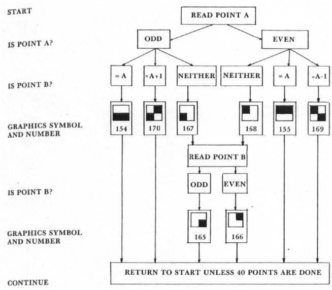 The program is designed first to scale the input data array, DA(I), between 0 and 40 (lines 5260 -5332) and put the results into array DY(I). Datasets with a difference between maximum and minimum values of more than 40 are condensed and smaller ones expanded on the graph. Both positive and negative values now will be plotted above the X-axis. Actual high (YH) and low (YL) values are saved and printed by line 5900 to give an idea of absolute as well as relative magnitudes. Next, 40 locations on the video display are computed for the scaled points. This must be done two points at a time because several symbols can be used to represent the pair, depending on whether they are equal, different by ± 1, or neither. Lines 5340 - 5780 code for the selection of the correct symbols. Figure 2 shows a decision tree that depicts how the choice is made. Since the first point of the pair automatically has an odd X-value (1, 3, 5, ...39) and the second an even value (2, 4, 6,...40), only Y-values need be evaluated as odd or even. Based on the following table of possible X, Y coordinates, the correct quadrants are chosen for each square: