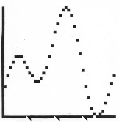 None of this would be any good without a curve to plot. Line 210 is where the user enters his equation (or READ statement for data input) before running the program. DA(I), the data array, remains unaltered in case it is needed elsewhere. Any number of variables supplied by the user and/or program may be used so long as they are assigned before line 210. Figure 3 shows a graph of DA(I) = SIN(I/X)-COS(I/Y) where X = 3, Y = 6.3, and I goes from 1 to 40. Note that the scaled value of the 34th point is zero and that a blank spot is placed on the X-axis under the previous point.