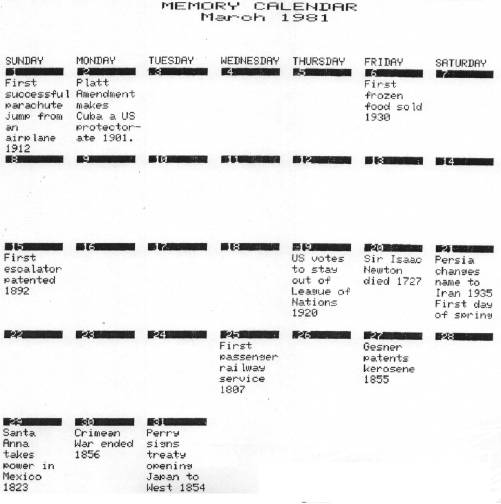 I have tried to make Memory Calendar as foolproof as possible, so that it can be used with ease by people who can type but who know little about computers. My intention was to write a useful utility that would work for anyone.