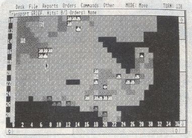 Moving units is what you'll be doing most, and here, the interface shines. The unit to be moved flashes, and you can either go to the (GEM) menus, type a one-letter command on the keyboard, or point with the mouse. With the mouse pointer, you simply go to the desired destination square and press the left button. A white line appears, linking the unit to the square. If you want that destination, simply release the button. The unit may take several turns to reach its destination, after which it will start flashing again, waiting for orders.