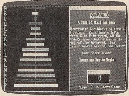 "The Pyramid Game" is a classic strategy puzzle that demonstrates the power of Amiga Basic. It's a stacking game in which you rear-range disks on a stick, attempting to sort them by size.