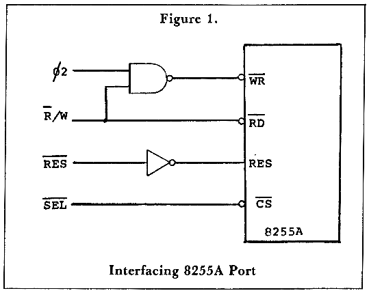 The low-true read gate of the 8255A, RD, can be the inverted R/W signal which need not (but can be) gated with ø2. The low-true write strobe, WR, is met by the normal 6502 write strobe, which we saw earlier is ø2 NANDed with the inverted R/W line. A high true Reset signal must be provided. Like most peripherals, it has a low-true chip select. Figure 1. shows the connections which satisfy the 8255A's timing requirements.