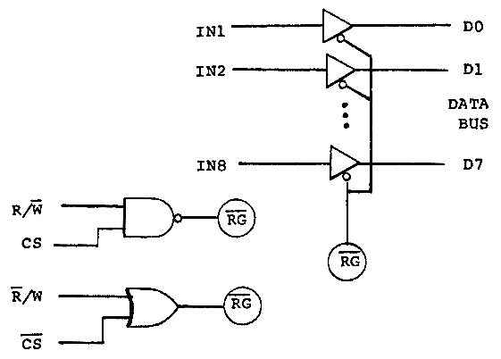 To make an input port, we need a set of tri-state® (® trademark National Semiconductor) gates which are gated in unison. A tri-state gate is an electronic switch. When enabled, the output reflects the input (sometimes with inversion). When disabled, the output is high impedance or floating. Thus a large number of tri-state outputs can be bussed together, provided that only one set or device is enabled at one time. RAM chips, ROM chips, and any other devices designed to attach directly to a bidirectional data bus have built in tri-state outputs.