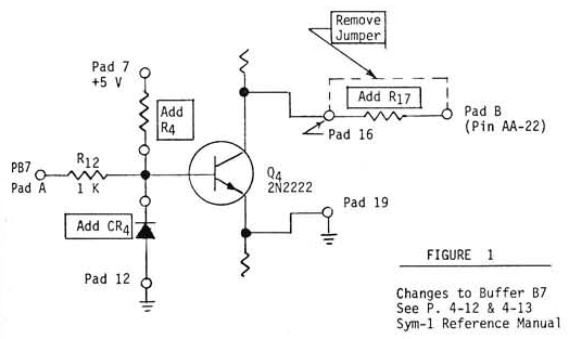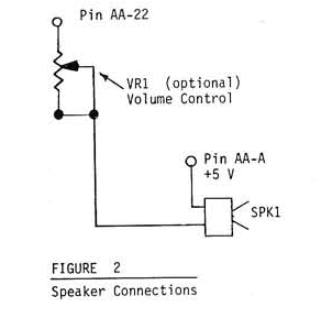 The program as written uses PB0 to PB3 of U29 as inputs and PB7 with its buffer as the speaker output. Figure 1 shows how to hook up buffer B7 for this application. Although it looks complicated, changing B7 is easy. All you have to do is remove one jumper wire and add two resistors and one diode. However, if you prefer, you can forget about buffer B7 and construct a similar speaker system externally, Again, in real life, PB7 would be connected to a large amplifier and speaker.