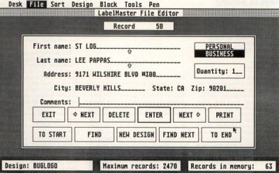 Now, let's get up close and personal. LabelMaster Elite is GEM based, with pull-down menus, mouse or one-stroke keyboard commands. The mailing list manager allows you to define business or personal records. Personal records have three lines of print; business records have four, allowing you an "Att:Name" on top if you wish. Both have an additional forty-character comment line which can be printed or not. It's nice for recording salient facts. Or rude remarks. Or clever slogans. There is room on the disk for about 1400 records, and, as LabelMaster Elite is not copy protected, you're not limited in storage capacity. If you run out of record room, just copy a new disk or trash some unnecessary files.