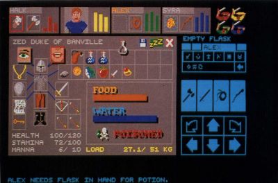 If you need a bite to eat, just click with the right button on the icon of the selected champion at the top of the screen, click on the object you want in the backpack (which holds 17 objects per party member), carry it to the mouth icon and click. . . glup. . .and the player's food indicator bar jumps up to a more acceptable level; the same occurs to satisfy thirst.