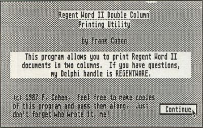The Regent Word II Double Column Utility program is a full-GEM program that uses the mouse to point and click on the document file to be printed. When the document is printed, the text will be formatted into a double-column format such as you would find in a newspaper or magazine. Note that, due to the size of this program, the program listings are not printed here. They are available on this month's disk version or in the ST SIG on DELPHI.