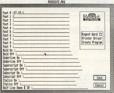 A special program has been included with the Double Column Utility to create a printer driver and the program is run from the GEM Desktop. I've included several pre-defined printer drivers, which you can modify using the Printer Driver Create program.