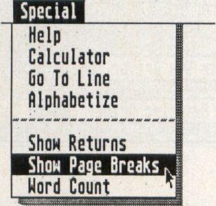 Page breaks may be made visible by moving the mouse pointer into the Special drop-down menu as shown in Figure 12 and clicking the Show Page Breaks option. A horizontal line will appear at a page break. The visible page breaks appear at the end of a sheet of 8 ½ × 11-inch paper. This may be adjusted for double column printing by adjusting the values found in the Global Format screen.