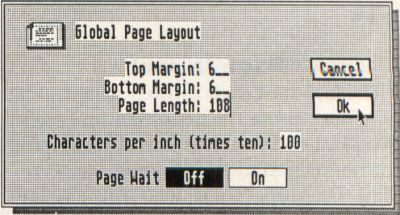 Move the mouse pointer into the print dropdown menu and click on the Global Format entry. Figure 13 shows the printing options that may be set from this dialog box. Change the page length to 108. This value was arrived at by subtracting the top margin and bottom margin from the page length. The result is multiplied by two (for double columns). Once the new value has been entered, press the return key. The Global Format screen will disappear.