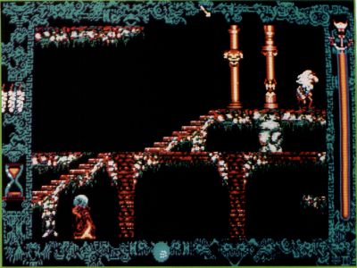 There appears to be a couple of minor glitches in the game. Sometimes, when falling down several levels of the castle, the figure you're controlling vanishes from the screen and doesn't reappear until the completion of the fall. Also, firing garlic at approaching monsters is a dangerous way to fight, due to the fact that the garlic only seems to actually fire about half the time.