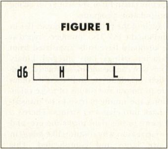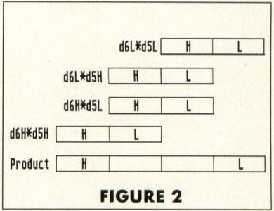 We can use this same technique to multiply the contents of the 68000's binary data registers. Suppose we wanted to multiply the contents of registers d5 and d6. Without bothering about the actual configuration of bits in the registers, we can imagine the numbers in them being arranged as in Figure 1, where each of the two registers is made up of a "high" word (16 bits) and a "low" word, represented by H and L, respectively.