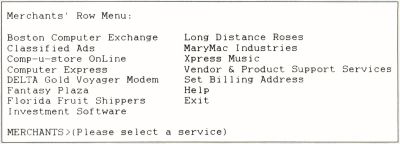 This month, fittingly enough, we'll take a glimpse into DELPHI'S solution to some of this tedium. From the main menu you can enter an area called the "Merchants Row," an electronic shopping mall of sorts. You'll discover that you're able to buy most anything that you could find at your neighborhood shopping center, and it's all accessible from your keyboard.