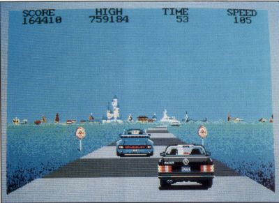 Unfortunately, Crazy Cars has an unfinished feel, as if the programmers got to the point where the game was just playable and then called it quits. For instance, unlike Pole Position, when your car crashes there is no explosion effect; you just slow down and lose some time. In fact, as far as animation goes, about the only "extra" is the way the car bounces when it goes over a bump at high speed.