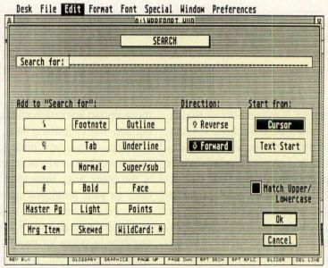 Even the rather mundane search-and-replace functions have some extras built in. For example, you can search for special characters (carriage returns, section markers) as well as text effects—that is, where the text becomes bold, underlined or changes face or point size. Note that while you can search for special effects, you can't include the effect in your replacement string. Searching can be either forward or backward, and can start from the cursor position or from the beginning of the document.