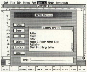 There are also some extras built into WordUp that will be appreciated by "power writers." The glossary feature lets you expand single words or short phrases into whole blocks of text, including special formatting. You can even store a whole document as a single glossary entry. Blocks of text can be added to the glossary by simply highlighting the block and selecting the appropriate button from the glossary dialog box. Full mail-merge capabilities are also supported. Mail-merge is a little complex, because it involves a text file, a database file and a control file, which puts the two together. However, mail-merged letters are very flexible, and both fixed field length and SDF-type files are supported. An appendix to the manual details how to set up a file with many of the popular databases.