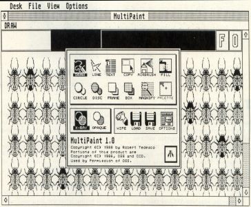The options dialog contains control settings for weights and line styles, plus the airbrush. Select your icon by left-clicking the mouse. To exit, click on the Atari symbol in the lower right-hand corner.
