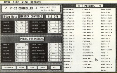 Owners of the Roland MT-32 synthesizer may be able to make use of PolySoft's newly released MT-32 Controller, a desk accessory that may be called up without exiting the currently running application. All the program's parameters, including MIDI channel, tuning, patch choice and panning, may be set using the mouse, and all patches and configurations may be saved to or loaded from disk.