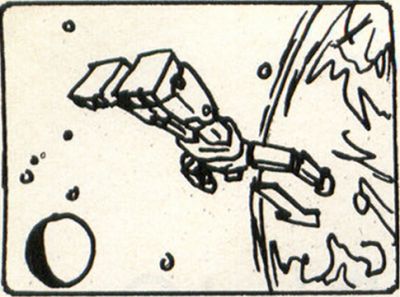 Let's consider why the storyboards were drawn as they were. The characters are in a giant robot ship heading towards Earth. I established this by first drawing a robot flying towards the Earth (note the arrow indicating how it is to move). I put the moon in the background to reinforce that the planet is Earth. I then reversed angles to view the robot in a close-up, allowing the viewer to see the silhouettes of the characters through the robot's eyes/windows. This not only gives the viewer a better look at the robot, but also establishes its scale, and that it is actually a vessel with people on board.