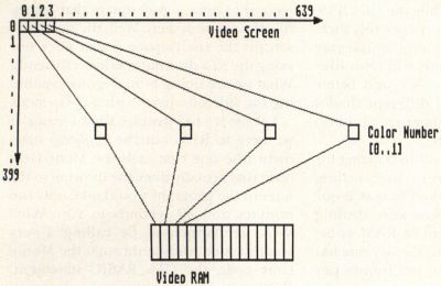 With a monochrome monitor hooked up, the graphics processor chip reads and displays this 32K block of memory 70 times each and every second. It's quite simple and easy to understand. Too bad the same can't be said when working with color.