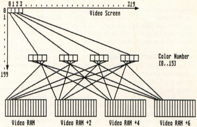 Let's start at the beginning. You, the computer, want to display the first pixel in the top left-hand corner of the screen. Since this is the 16-color mode, we'll need four bits of information. The obvious method (that of using the first four bits in the first byte of video RAM) is, unfortunately, not the correct one. We instead must take the first bit from each of the first four words, combine them (in reverse order) before we finally get the color number. This four-bit number is an index into our array of 16 colors used to select the proper values of red, green and blue to paint at that point on the screen.