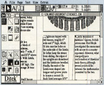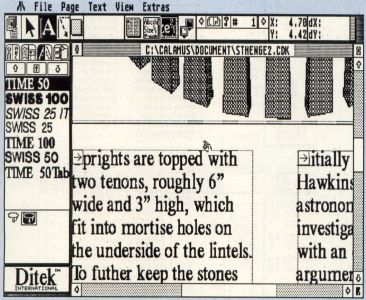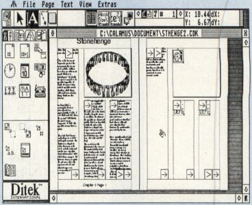 One of the nightmares a layout designer must work with is the shifting nature of available space in a commercial publication. Articles, if not edited to fit the space, often have to jump great gaps of pages to continue. Calamus handles this with ease, even permitting jumps to previous pages, not merely those following. It also supports automatic text flow from one page to another.